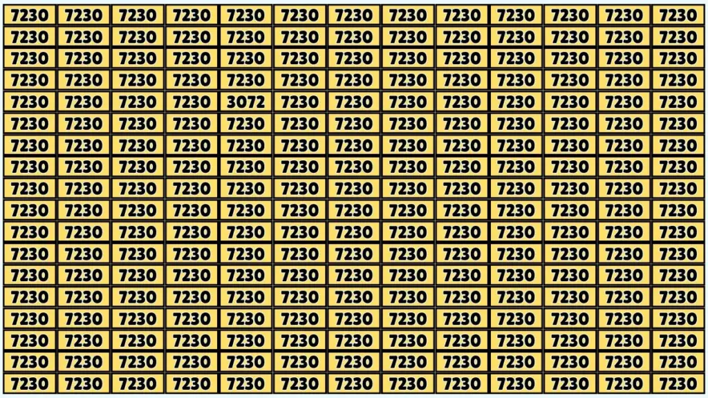 At first glance, the puzzle looks extremely confusing. The screen is filled with several numbers written close together, most of them being 7230. However, hidden cleverly in between them is the number 3072, which looks very similar when placed in a jumbled pattern.